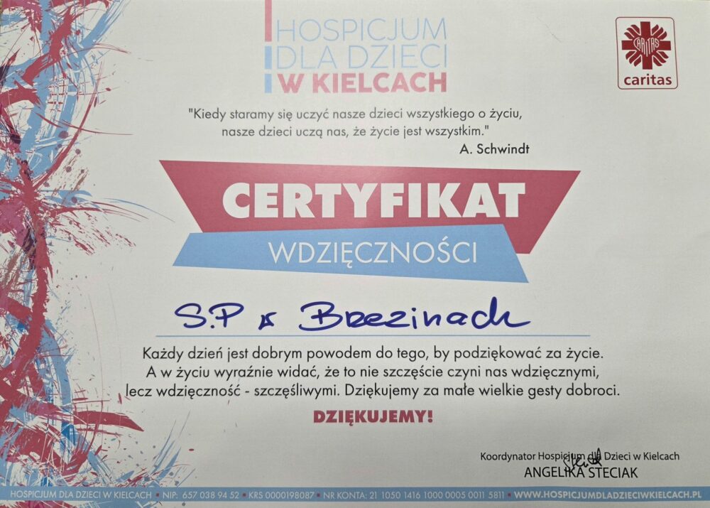 25 stycznia odbył się 34. Finał WOŚP. W tym roku orkiestra grała pod hasłem: Zdrowe brzuszki naszych dzieci. Przed kościołem w Brzezinach odbyła się zbiórka pieniędzy do tradycyjnych tekturowych puszek, w którą zaangażowały się uczennice z klasy 6: Liliana Walas, Kornelia Śnioch i Gabriela Ramiączek, uczniowie z klasy 7a: Kornelia Tkacz, Antoni Tarach i Piotr Kamiński oraz uczennice z klasy 7b: Julia Szczukiewicz, Malwina Januszek i Gabriela Witkowska, pod opieką nauczycieli: p. Agaty Kurdek i p. Anny Gawior oraz przedszkolaki-wolontariuszki z Akademii Przedszkolaka: Antonina Zawłocka, Hanna Wawrzeńczyk i Hanna Szeląg, pod opieką Rodziców. Zebraliśmy kwotę 3647, 27 zł, która została przekazana do sztabu głównego w Morawicy. Mieszkańcy, jak zawsze, byli bardzo hojni. W sztabie głównym w Morawicy pomagały uczennice z klasy 8: Maja Bernacka, Patrycja Madej i Julia Siekaniec, a uczennice z klasy 7a i 7b zaprezentowały swój talent wokalny, pod opieką p. Pauliny Pietryki. Jak co roku, o tej samej porze, finał akcji zakończyło tradycyjne „światełko do nieba”. Pani Aleksandra Głodek, będąca członkiem sztabu głównego w Morawicy, poprowadziła licytacje stacjonarne w Samorządowym Centrum Kultury i Biblioteki w Morawicy i czuwała nad organizacją wydarzenia. Dziękujemy wszystkim mieszkańcom naszej gminy, którzy w tym szczególnym dniu grali razem z orkiestrą za hojność, otwartość i bezinteresowną pomoc.