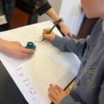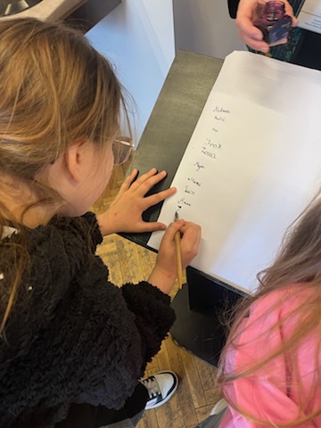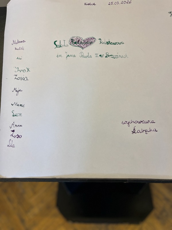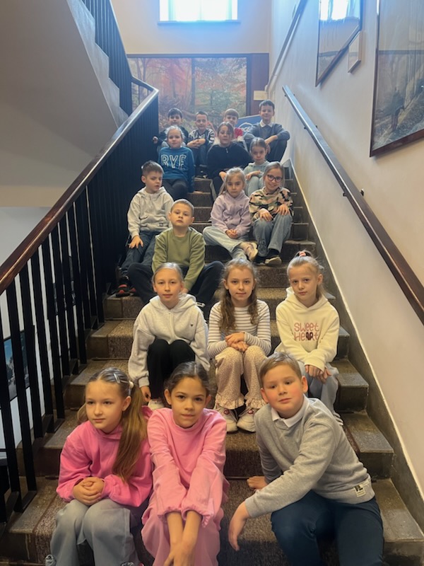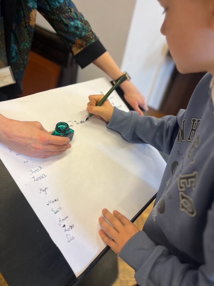 Największą atrakcją wyjazdu okazała się jednak praktyczna lekcja kaligrafii. Nasi uczniowie na chwilę zamienili się w XIX-wiecznych gimnazjalistów. Zamiast długopisów w dłoniach pojawiły się tradycyjne obsadki ze stalówkami oraz słoiczki z prawdziwym atramentem. Choć początki nie były łatwe, a na kartkach gdzieniegdzie pojawiały się kleksy, pisanie piórem okazało się dla drugoklasistów niesamowitą zabawą. Cierpliwe kreślenie liter i dbanie o każdą linię uświadomiło nam, ile czasu i staranności wymagało dawniej napisanie zwykłego listu czy wypracowania. Ta lekcja cierpliwości wywołała mnóstwo uśmiechów i dumy z własnoręcznie wypisanych kart.
