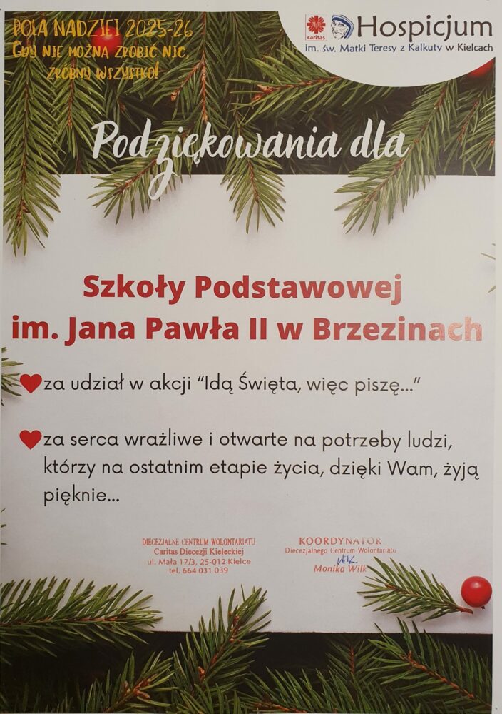 „Człowiek jest tyle wart, ile może dać drugiemu człowiekowi” – te słowa św. Jana Pawła II stały się motywem przewodnim tegorocznej akcji „Paczka na Święta”. Szkoła Podstawowa w Brzezinach już po raz kolejny włączyła się w inicjatywę organizowaną przez Urząd Miasta i Gminy Morawica, udowadniając, że pomaganie to nasza szkolna domena.